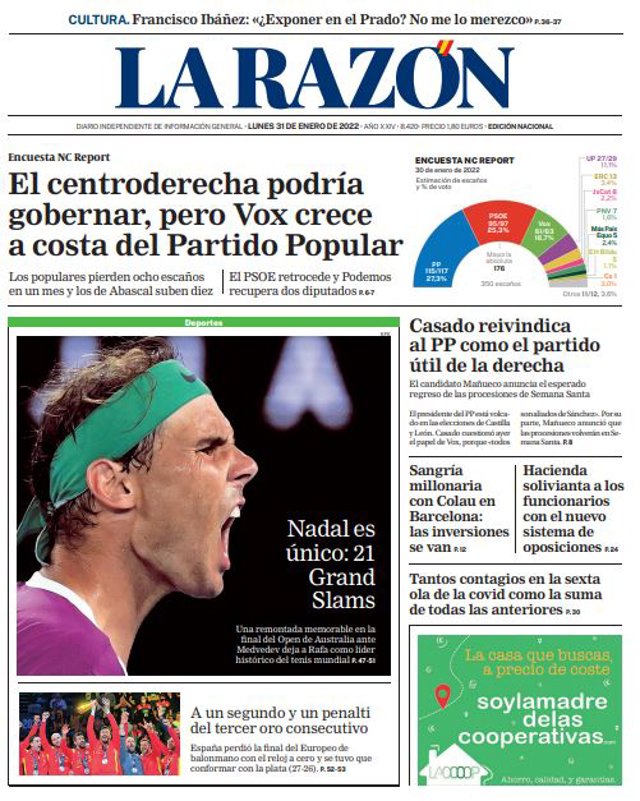 LA RAZÓN: "El centroderecha podría gobernar, pero Vox crece a costa del Partido Popular"; "Casado reivindica al PP como el partido útil de la derecha"; "Sangría millonaria con Colau en Barcelona: las inversiones se van"; "Hacienda solivianta a los funcionarios con el nuevo sistema de oposiciones"; "Tantos contagios en la sexta ola de la covid como la suma de todas las anteriores".