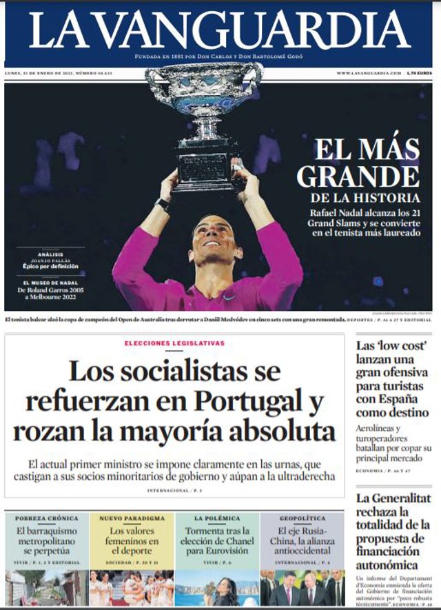 LA VANGUARDIA: "El más grande de la historia"; "Los socialistas se refuerzan en Portugal y rozan la mayoría absoluta"; "Las 'low cost' lanzan una gran ofensiva para turistas con España como destino"; "La Generalitat rechaza la totalidad de la propuesta de financiación autonómica".