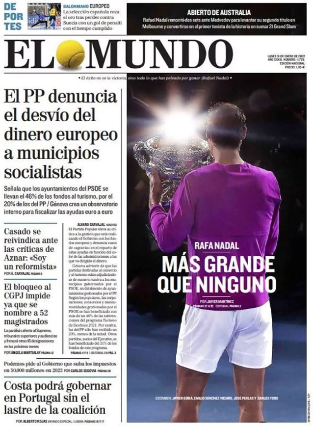 EL MUNDO: "El PP denuncia el desvío del dinero europeo a municipios socialistas"; "Rafa Nadal más grande que ninguno"; "Casado se reivindica ante las críticas de Aznar: 'Soy un reformista'"; "El bloqueo al CGPJ impide ya que se nombre a 52 magistrados"; "Costa podrá gobernar en Portugal sin el lastre de la coalición".