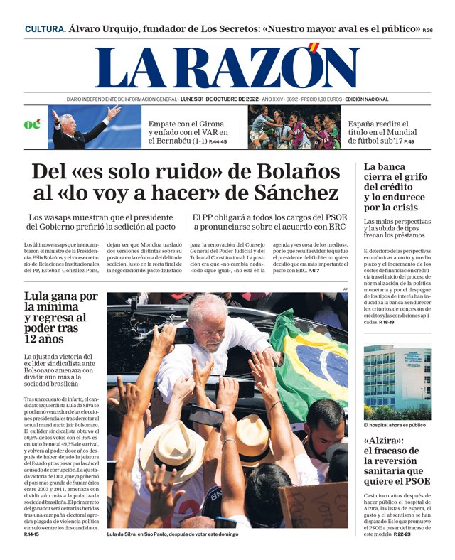 LA RAZÓN: "Del "es solo ruido" de Bolaños al "lo voy a hacer" de Sánchez"; "La banca cierra el grifo del crédito y lo endurece por la crisis"; "Lula gana por la mínima y regresa al poder tras 12 años"; "Alzira: el fracaso de la reversión sanitaria que quiere el PSOE".