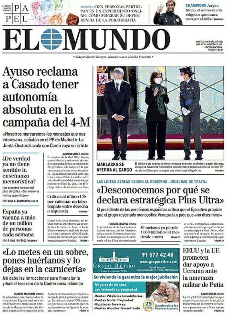 EL MUNDO: "Ayuso reclama a Casado tener autonomía absoluta en la campaña del 4-M"; "¿De verdad ya no tiene sentido la enseñanza memorística?"; "España ya vacuna a más de un millón de personas cada semana"; ""Lo metes en un sobre, pones huérfanos y lo dejas en la carnicería"; "Las líneas aéreas exigen al Gobierno "igualdad de trato": "Desconocemos por qué se declara estratégica Plus Ultra"; "EEUU y la UE prometen dar apoyo a Ucrania ante la amenaza militar de Putin".