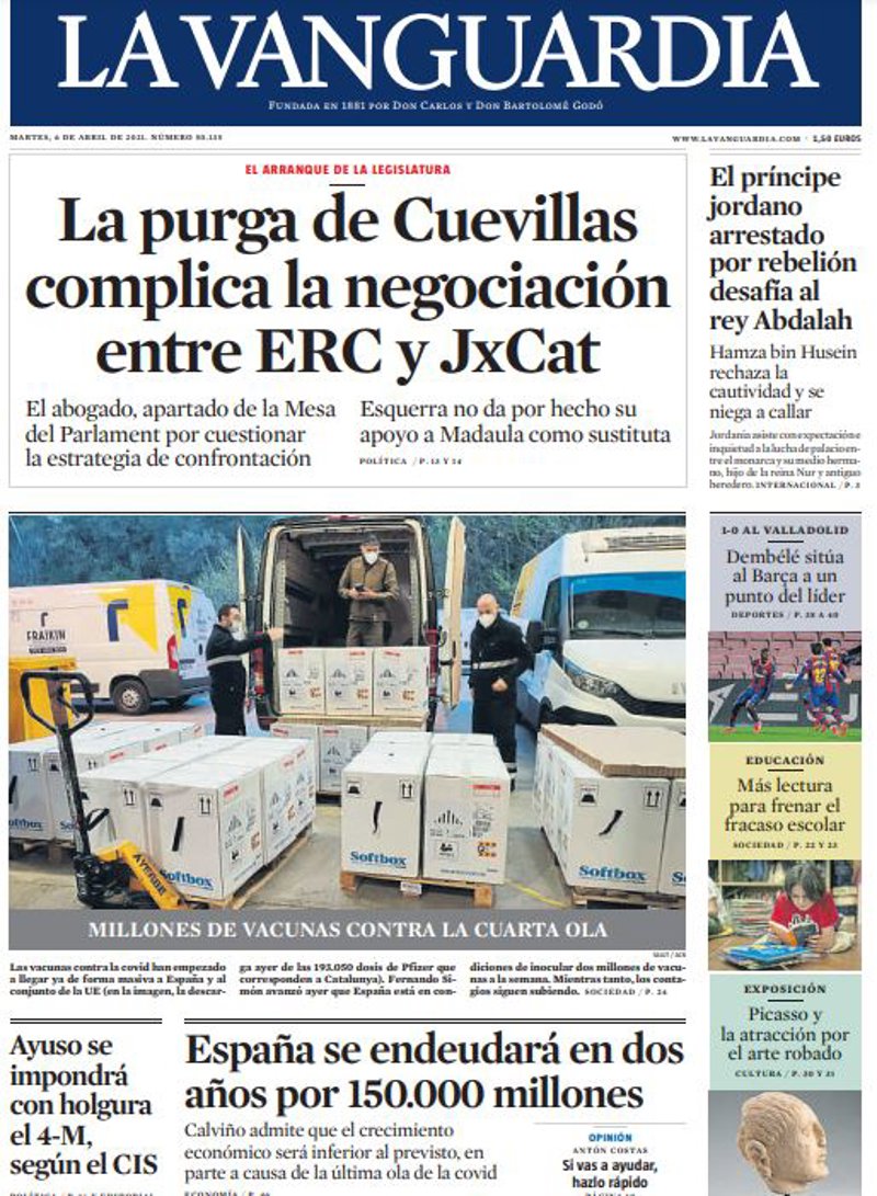 LA VANGUARDIA: "La purga de Cuevillas complica la negociación entre ERC y JxCat"; "España se endeudará en dos años por 150.000 millones"; "Ayuso se impondrá con holgura el 4-M, según el CIS"; "El príncipe jordano arrestado por rebelión desafía al rey Abdalah".