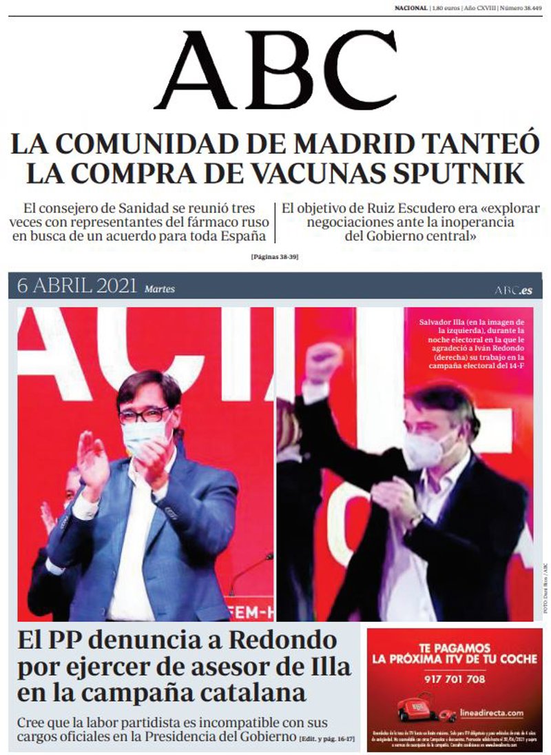 ABC: "La Comunidad de Madrid tanteó la compra de vacunas Sputnik. El consejero de Sanidad se reunió tres veces con representantes del fármaco ruso en busca de un acuerdo para toda España. El objetivo de Ruiz Escudero era "explorar negociaciones ante la inoperancia del Gobierno central""; "El PP denuncia a Redondo por ejercer de asesor de Illa en la campaña catalana. Cree que la labor partidista es incompatible con sus cargos oficiales en la Presidencia del Gobierno".