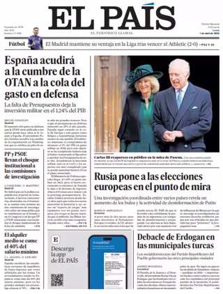 EL PAÍS: "España acudirá a la cumbre de la OTAN a la cola del gasto en defensa"; "Rusia pone a las elecciones europeas en el punto de mira"; "Debacle de Erdogan en las municipales turcas"; "PP y PSOE llevan el choque institucional a las comisiones de investigación"; "El alquiler medio se come el 40% del salario mínimo".