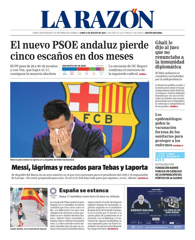 LA RAZÓN: "El nuevo PSOE andaluz pierde cinco escaños en dos meses"; "Ghali le dijo al juez que no renunciaba a la inmunidad diplomática"; "Los epidemiólogos piden la vacunación forzosa de los sanitarios para proteger a los enfermos"; "Messi, lágrimas y recados para Tebas y Laporta", "Se despidió del Barça en un acto emotivo en el que tuvo mensajes para el presidente del club y el responsable de La Liga".