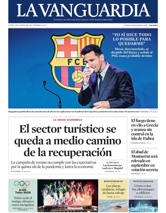 LA VANGUARDIA: "Yo sí hice todo lo posible para quedarme", "Messi, desconsolado, se despide del Barça y señala al PSG como probable destino"; "El sector turístico se queda a medio camino de la recuperación"; "El fuego tiene en vilo a Grecia y avanza sin control en la isla de Eubea"; "El abad de Montserrat será relevado en septiembre en votación secreta".