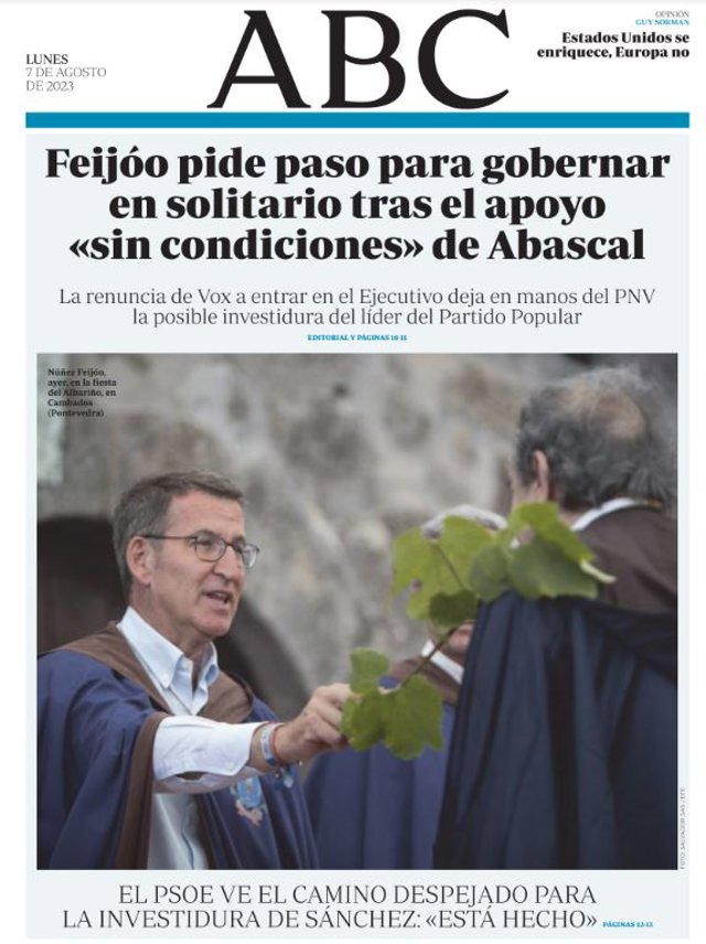 ABC: "Feijóo pide paso para gobernar en solitario tras el apoyo sin condiciones de Abascal"; "El PSOE ve el camino despejado para la investidura de Sánchez: "Está hecho".