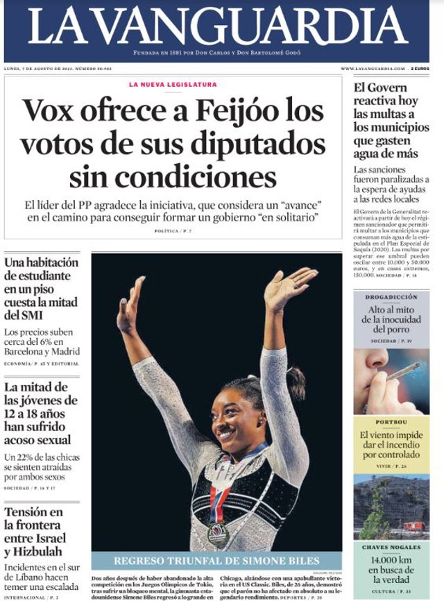 LA VANGUARDIA: "Vox ofrece a Feijóo los votos de sus diputados sin condiciones"; "El Govern reactiva hoy las multas a los municipios que gasten agua de más"; "Una habitación de estudiante en un piso cuesta la mitad del SMI"; "La mitad de las jóvenes de 12 a 18 años han sufrido acoso sexual"; "Tensión en la frontera entre Israel y Hizbulah"; "Regreso triunfal de Simone Biles".