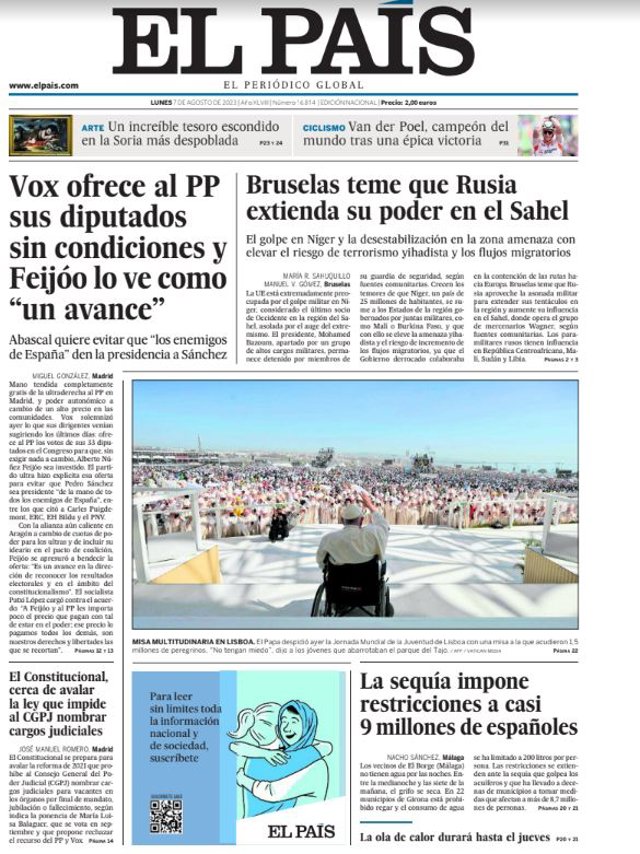 EL PAÍS: Vox ofrece al PP sus diputados sin condiciones y Feijóo lo ve como "un avance"; Bruselas teme que Rusia extienda su poder en el Sahel; "El Constitucional, cerca de avalar la ley que impide al CGPJ nombrar cargos judiciales"; "La sequía impone restricciones a casi 9 millones de españoles".