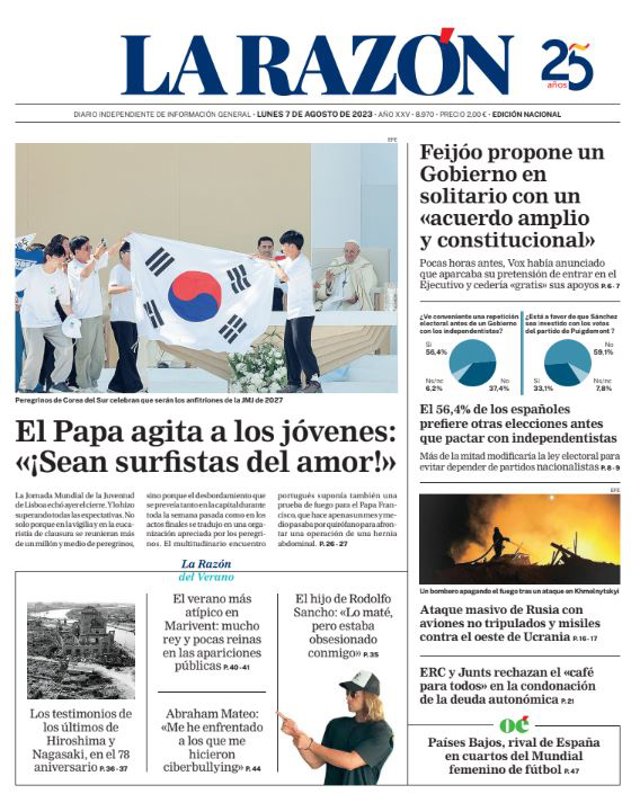 LA RAZÓN: "El Papa agita a los jóvenes: ¡Sean surfi stas del amor!"; "Feijóo propone un Gobierno en solitario con un acuerdo amplio y constitucional"; "El 56,4% de los españoles prefiere otras elecciones antes que pactar con independentistas"; "Ataque masivo de Rusia con aviones no tripulados y misiles contra el oeste de Ucrania"; "ERC y Junts rechazan el café para todos en la condonación de la deuda autonómica".