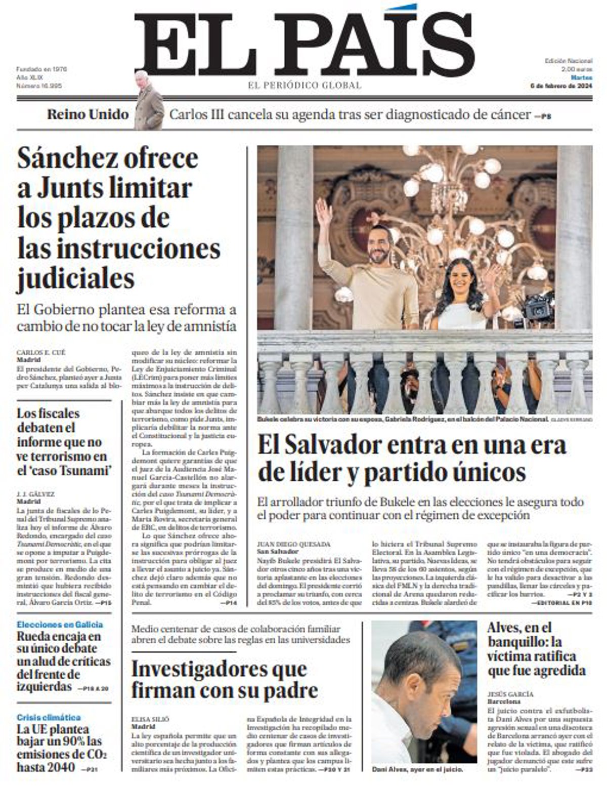 EL PAÍS: "Sánchez ofrece a Junts limitar los plazos de las instrucciones judiciales"; "El Salvador entra en una era de líder y partido únicos"; "Investigadores que firman con su padre"; "Alves, en el banquillo: la víctima ratifica que fue agredida"; "Los fiscales debaten el informe que no ve terrorismo en el 'caso Tsunami'"; "Rueda encaja en su único debate un alud de críticas del frente de izquierdas"; "La UE plantea bajar un 90% las emisiones de CO2 hasta 2040".
