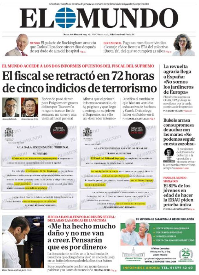 EL MUNDO: "El fiscal se retractó en 72 horas de cinco indicios de terrorismo"; "Dani Alves: "Me ha hecho mucho daño y no me van a creer. Pensarán que es por dinero""; "La revuelta agraria llega a España: "No somos los jardineros de Europa""; "Bukele arrasa con su promesa de acabar con las maras: "No podemos seguir con esa zozobra""; "El 81% de los jóvenes en edad de hacer la EBAU piden prueba única".