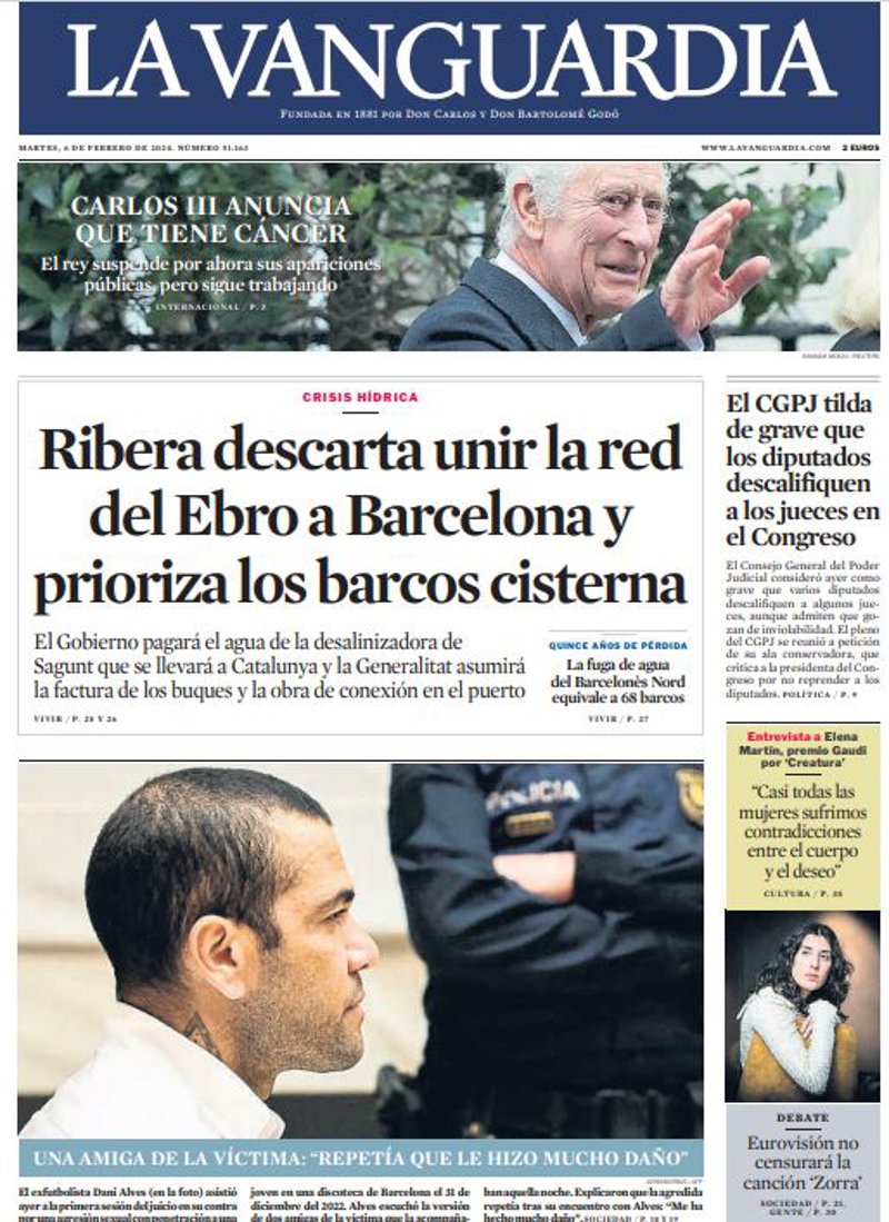 LA VANGUARDIA: "Ribera descarta unir la red del Ebro a Barcelona y prioriza los barcos cisterna"; "El CGPJ tilda de grave que los diputados descalifiquen a los jueces en el Congreso".