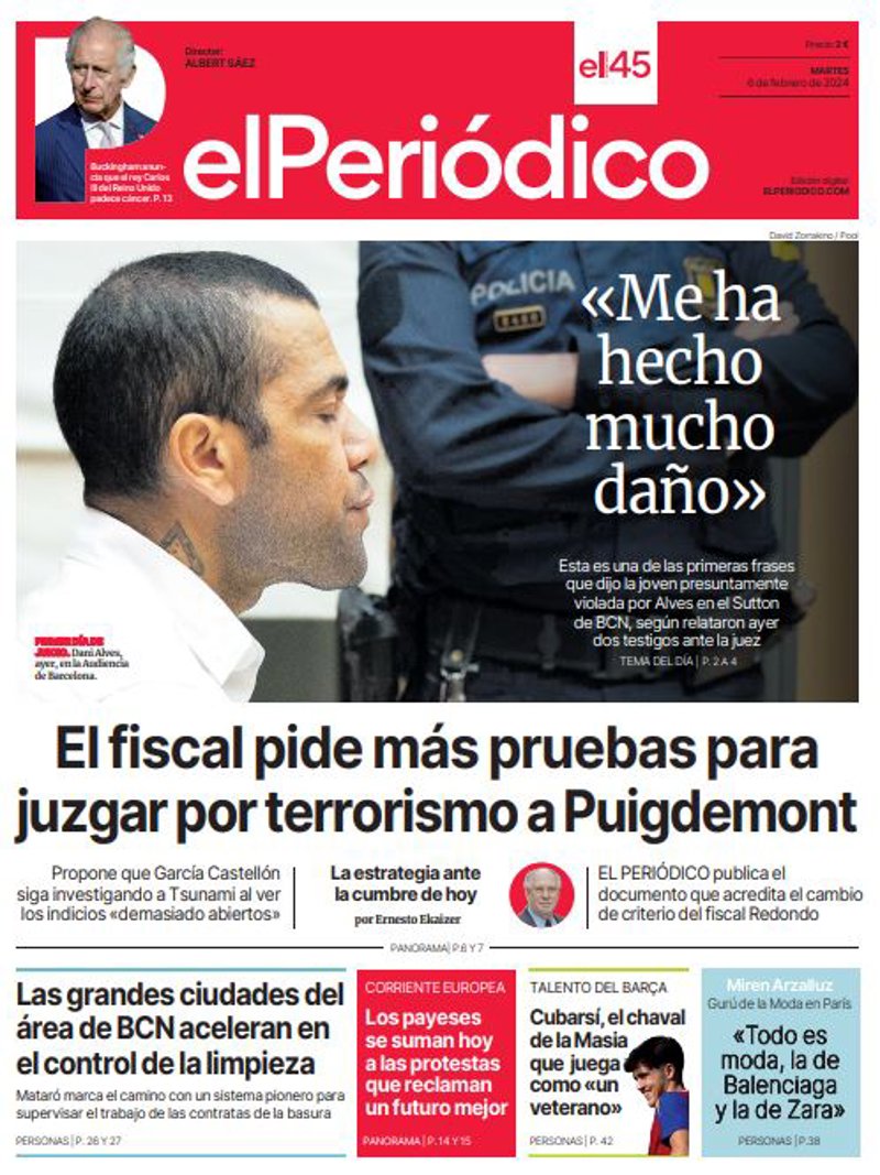 EL PERIÓDICO: "El fiscal pide más pruebas para juzgar por terrorismo a Puigdemont"; ""Me ha hecho mucho daño""; "Las grandes ciudades del área de BCN aceleran en el control de la limpieza"; "Los payeses se suman hoy a las protestas que reclaman un futuro mejor"; "Cubarsí, el chaval de la Masia que juega como "un veterano"".