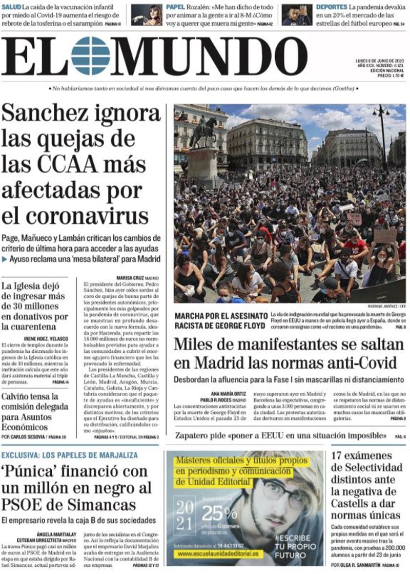 EL MUNDO: "Sánchez ignora las quejas de las CCAA más afectadas por el coronavirus"; "Miles de manifestantes se saltan en Madrid las normas anti-Covid"; "La Iglesia dejó de ingresar más de 30 millones en donativos por la cuarentena"; "Calviño tensa la comisión delegada para Asuntos Económicos"; "'Púnica' financió con un millón en negro al PSOE de Simancas"; "17 exámenes de Selectividad distintos ante la negativa de Castells a dar normas únicas".