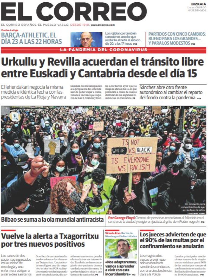 EL CORREO: "Urkullu y Revilla acuerdan el tránsito libre entre Euskadi y Cantabria desde el día 15"; "Vuelve la alerta a Txagorritxu por tres nuevos positivos"; "Los jueces advierten de que el 90% de las multas por el confinamiento se anularán"; "Bilbao se suma a la ola mundial antirracista"; "Vicente Atxa Rector de Mondragon Unibertsitatea: "Nos adaptaremos; vamos a aprender a vivir con esta incertidumbre"".