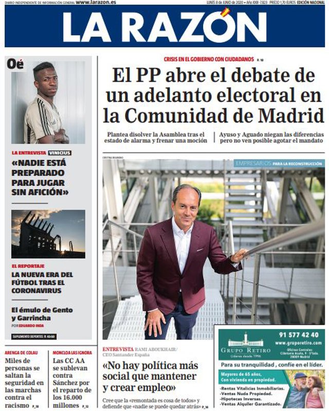 LA RAZÓN: "El PP abre el debate de un adelanto electoral en la Comunidad de Madrid"; "Miles de personas se saltan la seguridad en las marchas contra el racismo"; "Las CCAA se sublevan contra Sánchez por el reparto de los 16.000 millones"; "Entrevista Rami Aboukhair, CEO Santander España: "No hay política más social que mantener y crear empleo"".