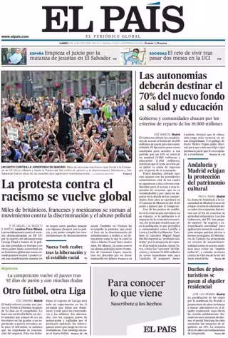 EL PAÍS: "La protesta contra el racismo se vuelve global"; "Otro fútbol, otra Liga. La competición vuelve el jueves tras 92 días de parón y con muchas dudas"; "Las autonomías deberán destinar el 70% del nuevo fondo a salud y educación"; "Andalucía y Madrid relajan la protección del patrimonio cultural"; "Dueños de pisos turísticos se pasan al alquiler residencial".