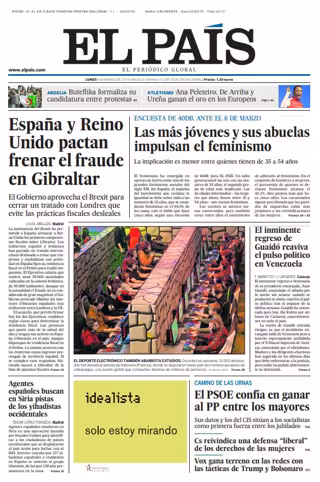EL PAÍS: "España y Reino Unido pactan frenar el fraude en Gibraltar"; "Las más jóvenes y sus abuelas impulsan el feminismo"; "El inminente regreso de Guaidó reaviva el pulso político en Venezuela"; "Agentes españoles buscan en Siria pistas de los yihadistas occidentales".