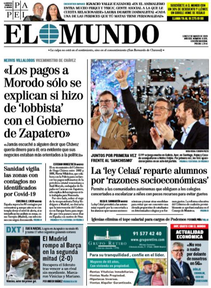 EL MUNDO: "Nervis Villalobos, viceministro de Chávez: "Los pagos a Morodo sólo se explican si hizo de 'lobbista' con el Gobierno de Zapatero"; "La 'ley Celaá' reparte alumnos por 'razones socioeconómicas'"; "Sanidad vigila las zonas con contagios no identificados por Covid-19"; "Iglesias elimina el tope salarial para cargos de Podemos".