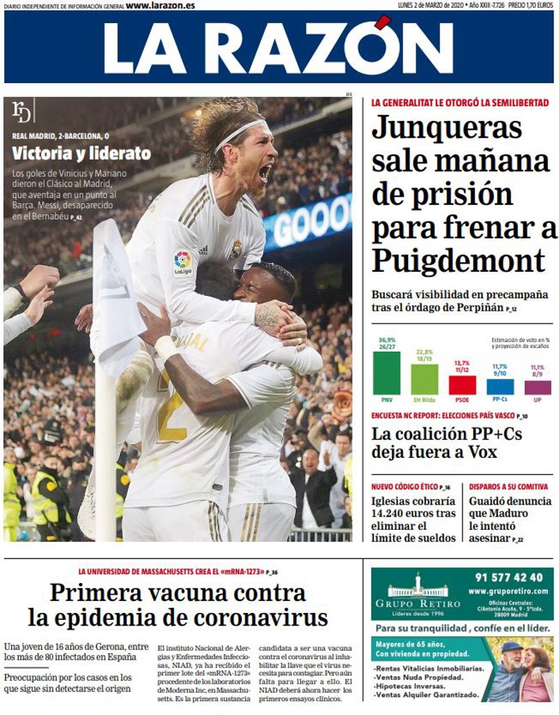 LA RAZÓN: "Junqueras sale mañana de prisión para frenar a Puigdemont"; "Primera vacuna contra la epidemia de coronavirus"; "La coalición PP+Cs deja fuera a Vox"; "Iglesias cobraría 14.240 euros tras eliminar el límite de sueldos"; "Guaidó denuncia que Maduro le intentó asesinar".