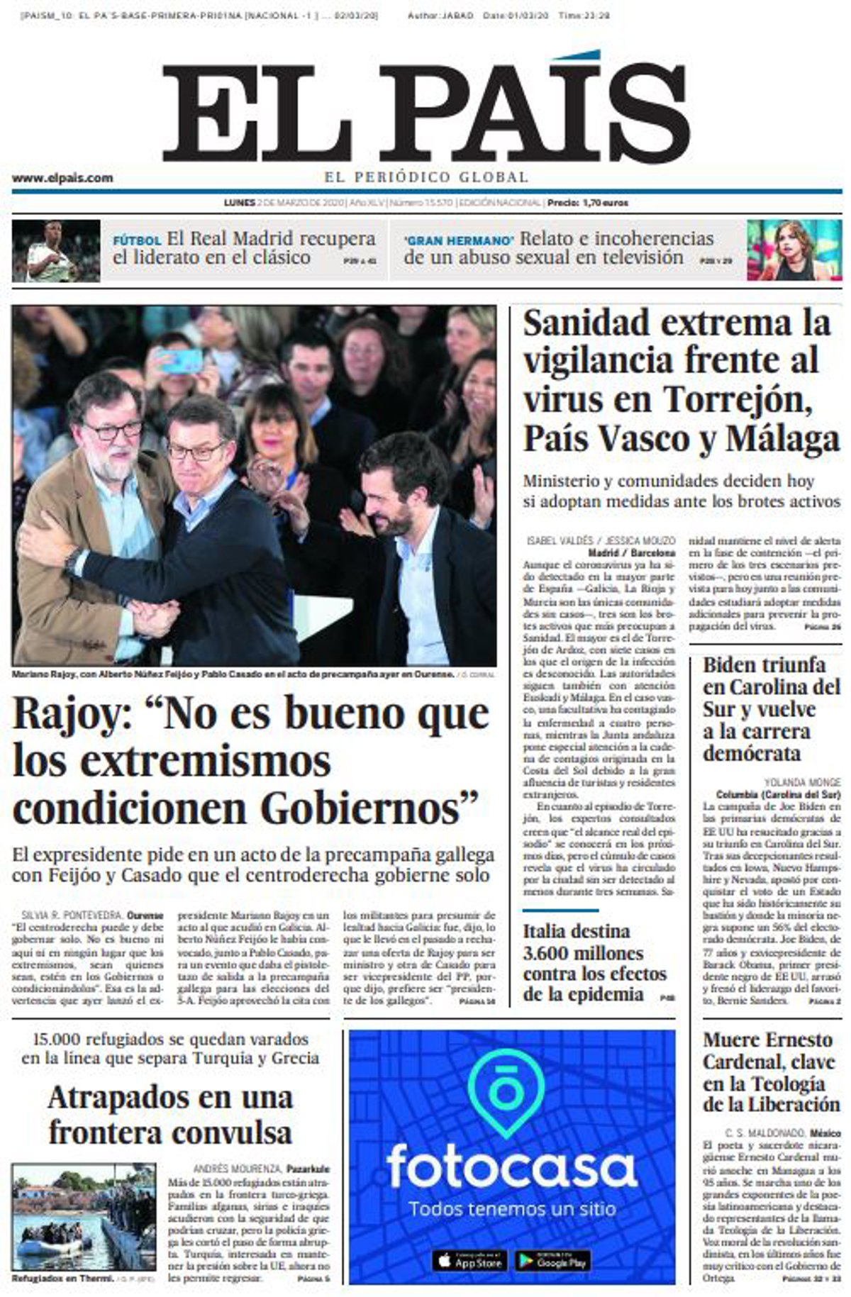 EL PAÍS: "Rajoy: "No es bueno que los extremismos condicionen Gobiernos"; "Sanidad extrema la vigilancia frente al virus en Torrejón, País Vasco y Málaga"; "Biden triunfa en Carolina del Sur y vuelve a la carrera demócrata"; "Italia destina 3.600 millones contra los efectos de la epidemia"; "Atrapados en una frontera convulsa".