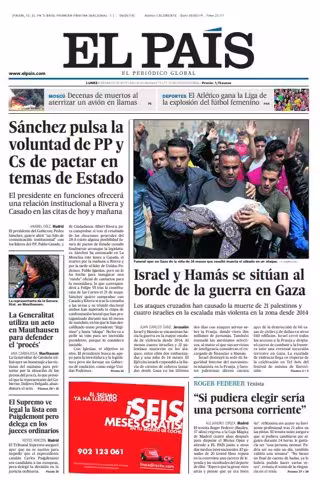 EL PAÍS: "Sánchez pulsa la voluntad de PP y Cs de pactar en temas de Estado"; "Israel y Hamás se sitúan al borde de la guerra en Gaza"; "La Generalitat utiliza un acto en Mauthausen para defender el 'procés'"; "El Supremo ve legal la lista con Puigdemont pero delega en los jueces ordinarios".