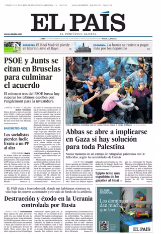 EL PAÍS: "PSOE y Junts se citan en Bruselas para culminar el acuerdo"; "Abbas se abre a implicarse en Gaza si hay solución para toda Palestina"; "Los socialistas pierden fuelle frente a un PP al alza"; "Destrucción y éxodo en la Ucrania controlada por Rusia".
