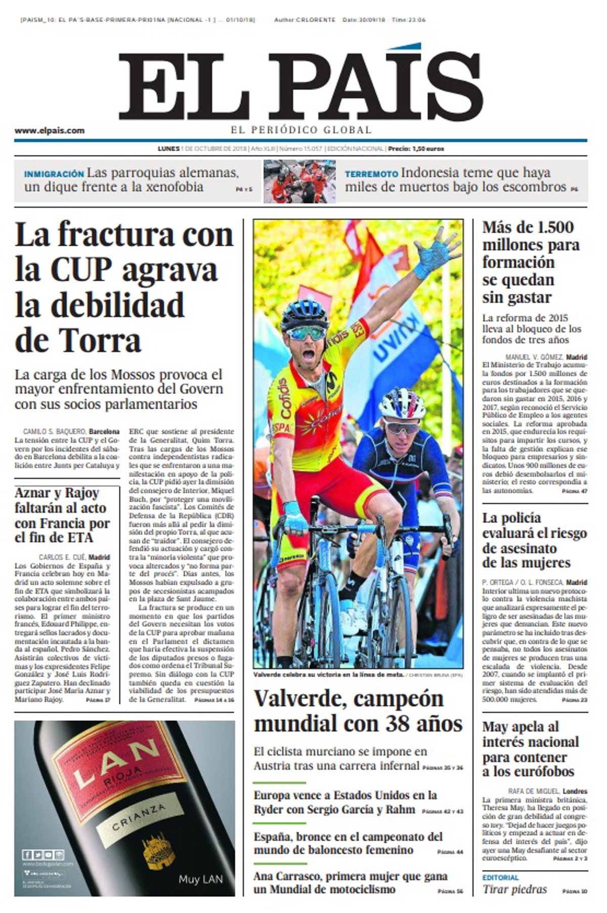 EL PAÍS: "La fractura con la CUP agrava la debilidad de Torra"; "Aznar y Rajoy faltarán al acto con Francia por el fin de ETA"; "Más de 1.500 millones para formación se quedan sin gastar"; "Valverde, campeón mundial con 38 años"; "La policía evaluará el riesgo de asesinato de las mujeres".