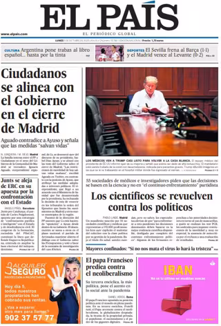 EL PAÍS: "Ciudadanos se alinea con el Gobierno en el cierre de Madrid"; "Junts se aleja de ERC en su apuesta por la confrontación con el Estado"; "Los científicos se revuelven contra los políticos"; "El papa Francisco predica contra el neoliberalismo".