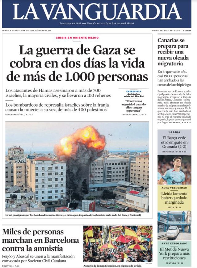 LA VANGUARDIA: "La guerra de Gaza se cobra en dos días la vida de más de 1.000 personas"; "Miles de personas marchan en Barcelona contra la amnistía"; "Canarias se prepara para recibir una nueva oleada migratoria".