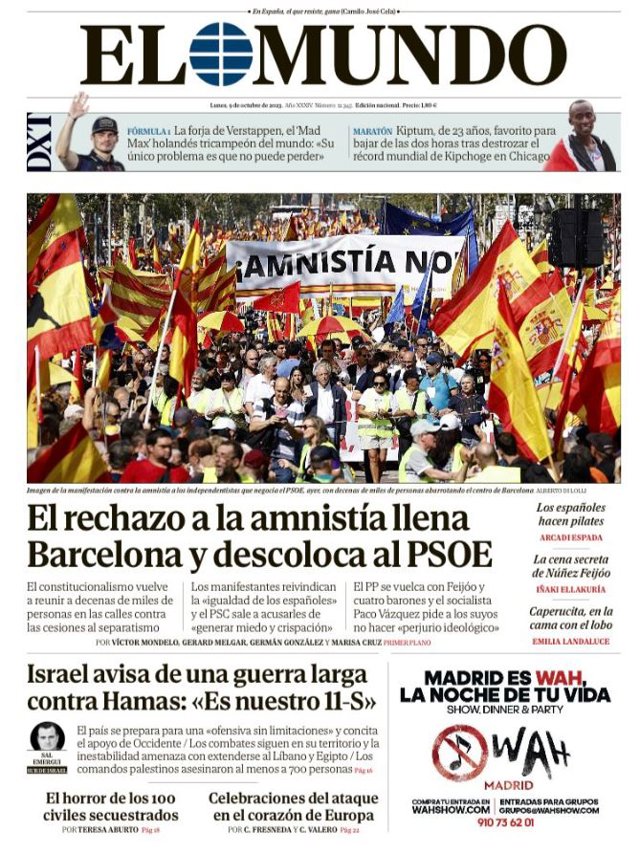 EL MUNDO: "El rechazo a la amnistía llena Barcelona y descoloca al PSOE"; "Israel avisa de una guerra larga contra Hamas: Es nuestro 11-S".