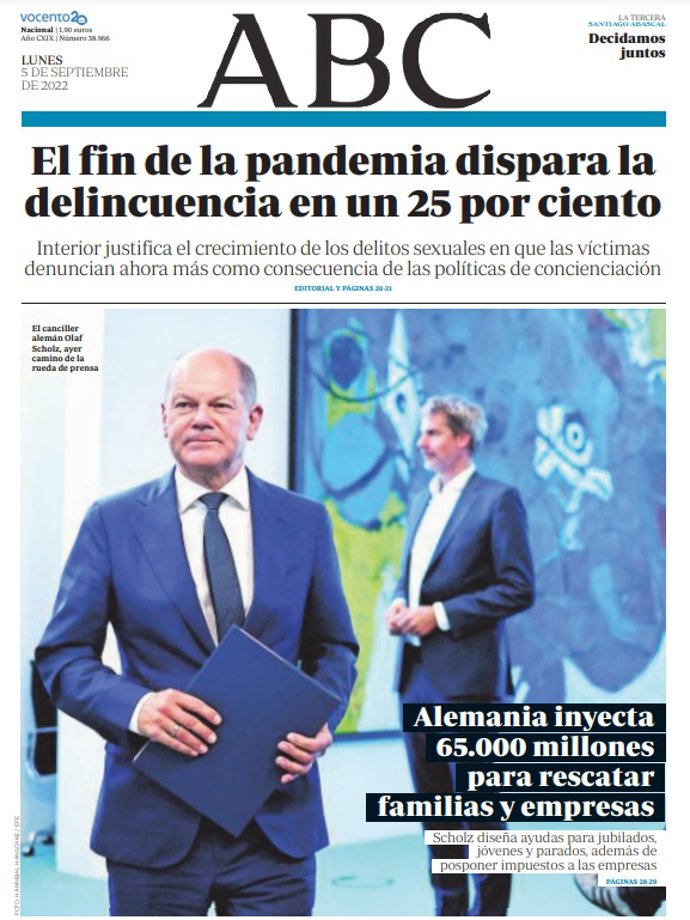 ABC: "El fin de la pandemia dispara la delincuencia en un 25 por ciento"; "Alemania inyecta 65.000 millones para rescatar familias y empresas".