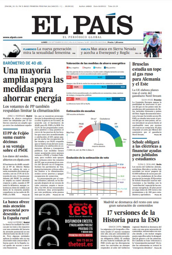 EL PAÍS: "Una mayoría amplia apoya las medidas para ahorrar energía"; "El PP de Feijóo suma cuatro décimas a su ventaja sobre el PSOE"; "La banca ofrece más atención presencial pero descuida a la España rural"; "Bruselas estudia un tope al gas ruso para Alemania y el Este"; "Scholz obligará a las eléctricas a financiar ayudas para jubilados y estudiantes".