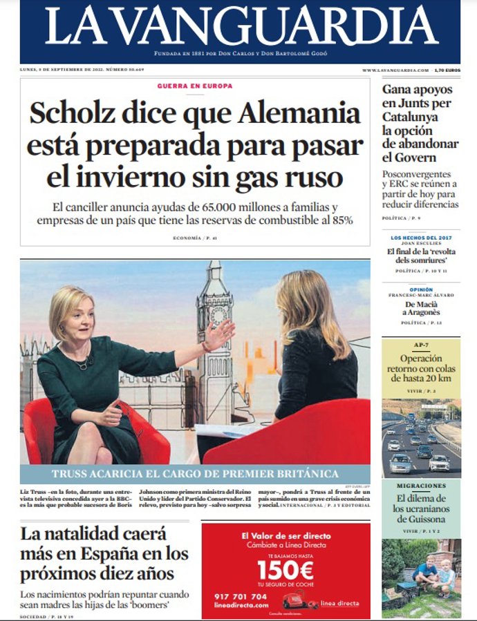LA VANGUARDIA: "Guerra en Europa. Scholz dice que Alemania está preparada para pasar el invierno sin gas ruso"; "Gana apoyos en Junts per Catalunya la opción de abandonar el Govern; "Truss acaricia el cargo de premier británica"; "La natalidad caerá más en España en los próximos diez años".