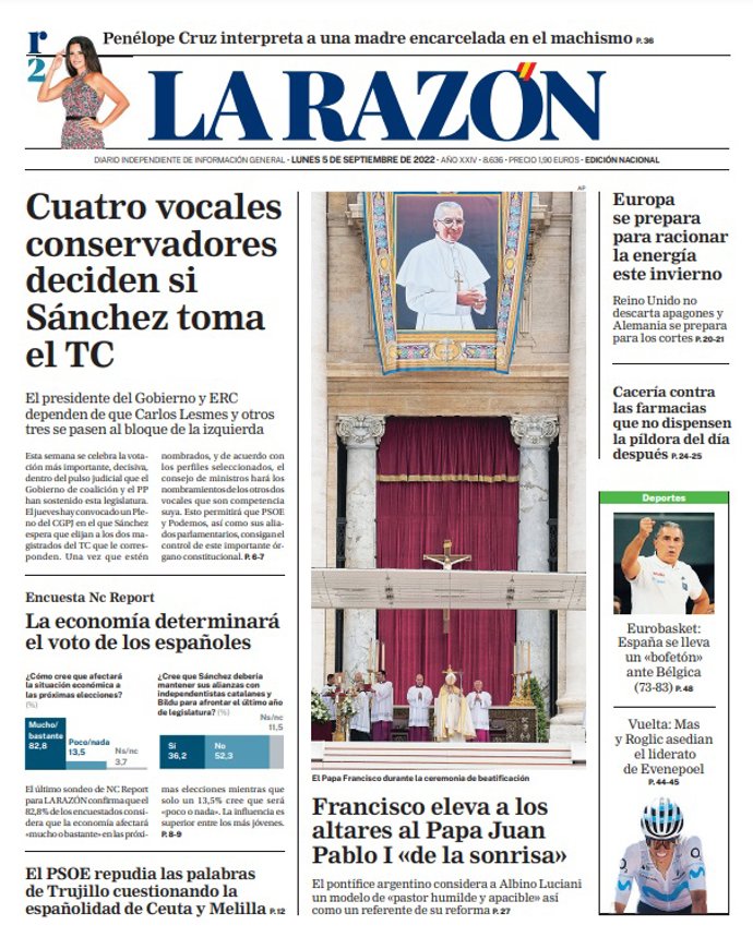 LA RAZÓN: "Cuatro vocales conservadores deciden si Sánchez toma el TC"; "Europa se prepara para racionar la energía este invierno"; "Encuesta Nc Report. La economía determinará el voto de los españoles"; "El PSOE repudia las palabras de Trujillo cuestionando la españolidad de Ceuta y Melilla"; "Francisco eleva a los altares al Papa Juan Pablo I "de la sonrisa"; "Cacería contra las farmacias que no dispensen la píldora del día después".