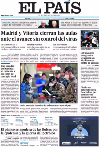 EL PAÍS: "Madrid y Vitoria cierran las aulas ante el avance sin control del virus"; "Una sanidad desbordada se enfrenta a los focos de contagio local"; "El pánico se apodera de las Bolsas por la epidemia y la guerra del petróleo"; "600 menores inmigrantes se hacinan en Melilla en un centro de acogida"; "Dimite un consejero de la Generalitat por encubrir un presunto acoso".