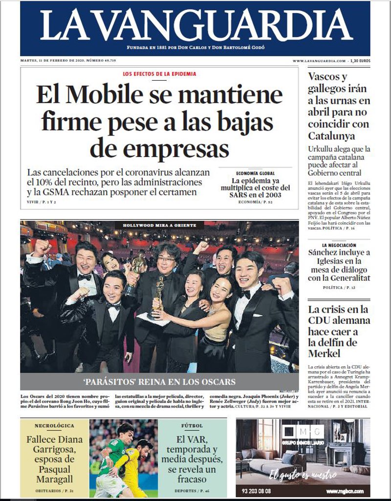 LA VANGUARDIA: "El Mobile se mantiene firma pese a las bajas de empresas. La epidemia ya multiplica el coste del SARS en el 2003"; "'Parásitos' reina en los Oscars"; "Vascos y gallegos irán a las urnas en abril para no coincidir con Catalunya"; "Sánchez incluye a Iglesias en la mesa de diálogo con la Generalitat"; "La crisis en la CDU alemana hace caer a la delfín de Merkel"; "Fallece Diana Garrogosa, esposa de Pasqual Maragall"; "El VAR, temporada y media después, se revela un fracaso".