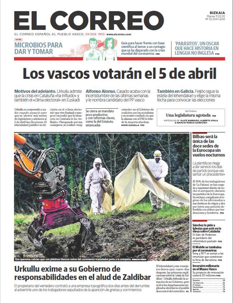 EL CORREO: "Los vascos votarán el 5 de abril"; "Urkullu exime a su Gobierno de responsabilidad en el alud de Zaldibar"; "Bilbao será la única de las doce sedes de la Eurocopa sin vuelos nocturnos"; "Sánchez le pide a Iglesias que esté en la mesa sobre Cataluña"; "El Mobile se tambalea por el coronavirus"; "Inversión millonaria en el Museo Vasco".