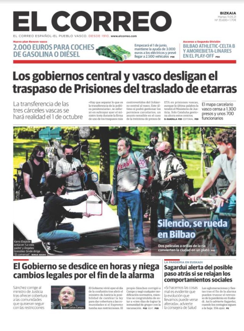 EL CORREO: "Los gobiernos central y vasco desligan el traspaso de Prisiones del traslado de etarras"; "El Gobierno se desdice en horas y niega cambios legales por el fin de la alarma"; "Silencio, se rueda en Bilbao"; "Sagardui alerta del posible paso atrás si se relajan los comportamientos sociales"; "2.000 euros para coches de gasolina o diesel".