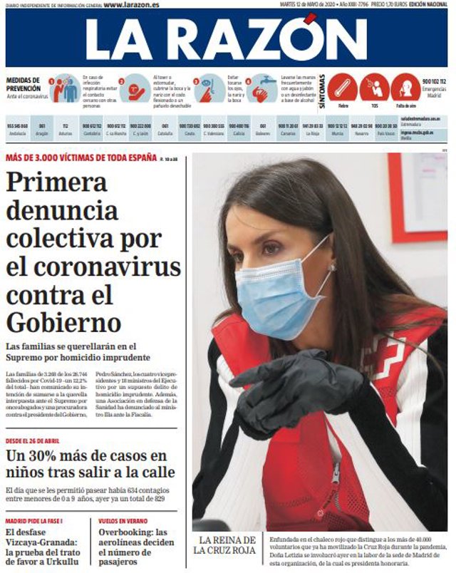 LA RAZÓN: "Primera denuncia colectiva por el coronavirus contra el Gobierno"; "Un 30% más de casos en niños tras salir a la calle"; "El desfase Vizcaya-Granada: la prueba del trato de favor a Urkullu"; "Overbooking: las aerolíneas deciden el número de pasajeros"; "La Reina de la Cruz Roja. Enfundada en el chaleco rojo que distingue a los más de 40.000 voluntarios que ya ha movilizado la Cruz Roja durante la pandemia, Doña Letizia se involucró ayer en la labor de la sede de Madrid de esta organización, de la cual es presidenta honoraria".