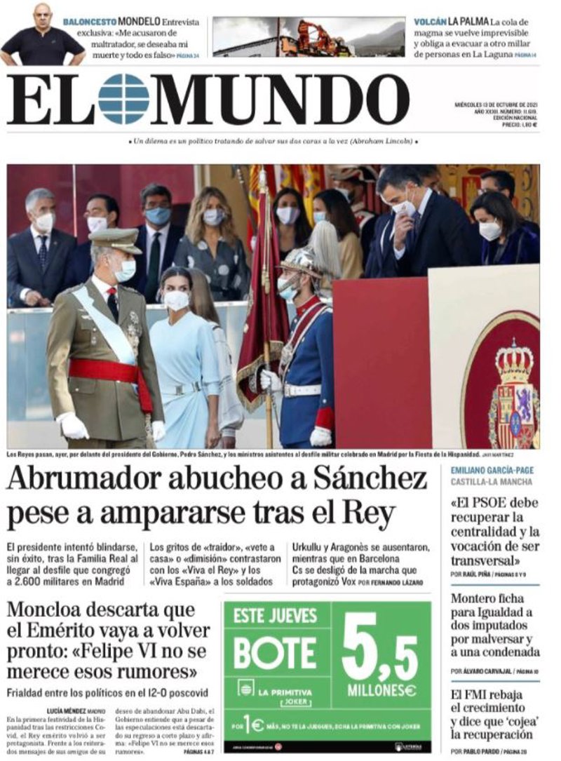 EL MUNDO: "Abrumador abucheo a Sánchez pese a ampararse tras el Rey", "Moncloa descarta que el Emérito vaya a volver pronto: 'Felipe VI no se merece esos rumores'"; "Montero ficha para Igualdad a dos imputados por malversas y a una condenada"; "El FMI rebaja el crecimiento y dice que 'cojea' la recuperación".