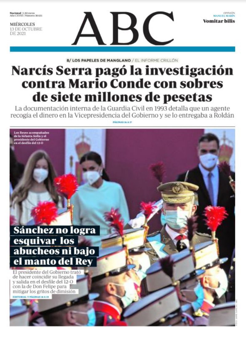 ABC: "Narcís Serra pagó la investigación contra Mario Conde con sobres de siete millones de pesetas"; "Sánchez no logra esquivar los abucheos ni bajo el manto del Rey".