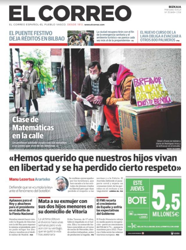 EL CORREO: "Clase de Matemáticas en la calle"; "'Hemos querido que nuestros hijos vivan en libertad y se ha perdido cierto respeto'"; "Aplausos para el Rey y abucheos para el presidente en el desfile de la Fiesta Nacional"; "Mata a su exmujer con