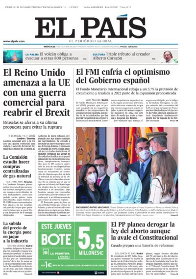 EL PAÍS: "El Reino Unido amenaza a la UE con una guerra comercial para reabrir el Brexit"; "El FMI enfría el optimismo del Gobierno español"; "El PP planea derogar la ley del aborto aunque la avale el Constitucional"; "La Comisión estudia hacer compras centralizadas de gas natural"; "Triple tributo al creador Alberto Corazón"; "Encuentro entre abucheos".