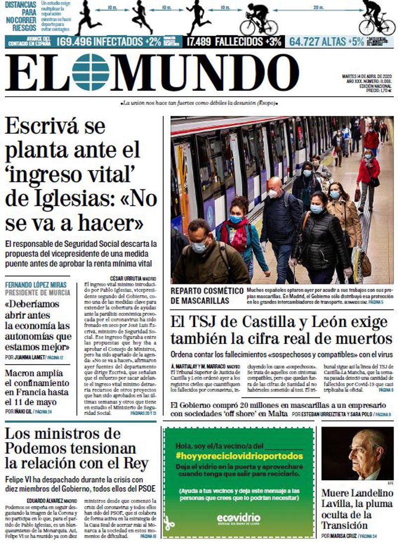EL MUNDO: "Escrivá se planta ante el 'ingreso vital' de Iglesias: "No se va a hacer""; "Los ministros de Podemos tensionan la relación con el Rey"; "Fernando López Miras: "Deberíamos abrir antes la economía las autonomías que estamos mejor"; "Macron amplía el confinamiento en Francia hasta el 11 de mayo"; "El TSJ de Castilla y León exige también la cifra real de muertos"; "Muere Landelino Lavilla, la pluma oculta de la Transición".