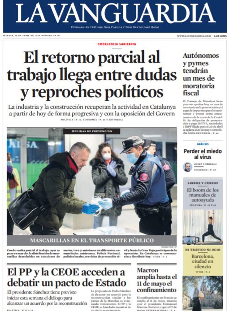 LA VANGUARDIA: "El retorno parcial al trabajo llega entre dudas y reproches políticos"; "El PP y la CEOE acceden a debatir un pacto de Estado"; "Autónomos y pymes tendrán un mes de moratoria fiscal".