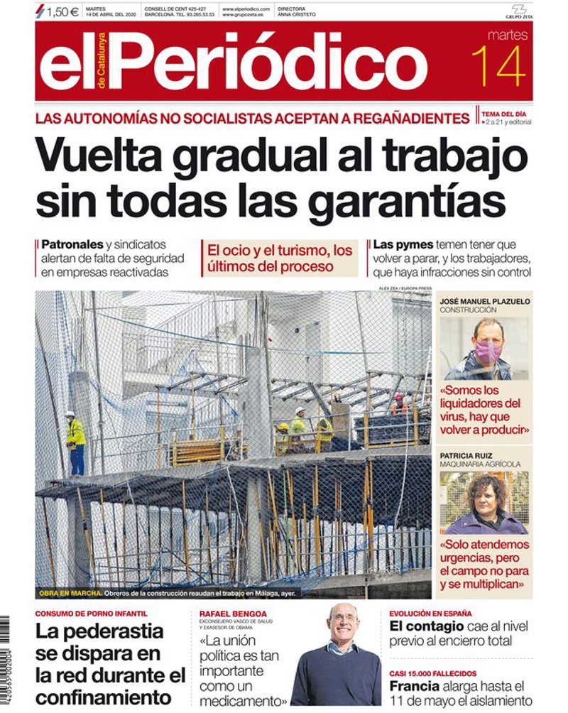 EL PERIÓDICO: "Vuelta gradual al trabajo sin todas las garantías"; "La pederastia se dispara en la red durante el confinamiento"; "Rafael Bengoa: "La unión política es tan importante como un medicamento"; "El contagio cae al nivel previo al encierro total"; "Francia alarga hasta el 11 de mayo el aislamiento".