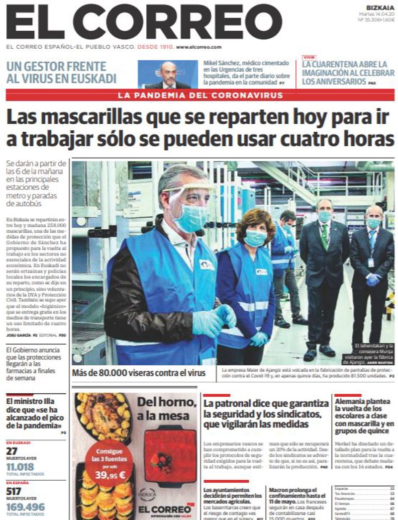 EL CORREO: "Las mascarillas que se reparten hoy para ir a trabajar sólo se pueden usar cuatro horas"; "Más de 80.000 viseras contra el virus"; "El ministro Illa dice que "se ha alcanzado el pico de la pandemia""; "La patronal dice que garantiza la seguridad y los sindicatos, que vigilarán las medidas"; "Alemania plantea la vuelta de los escolares a clase con mascarilla y en grupos de quince"; "Los ayuntamientos decidirán si permiten los mercados agrícolas"; "Macron prolonga el confinamiento hasta el 11 de mayo".