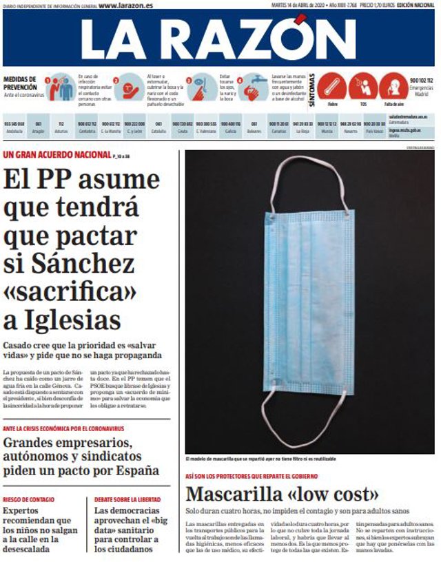 LA RAZÓN: "El PP asume que tendrá que pactar si Sánchez "sacrifica" a Iglesias"; "Grandes empresarios, autónomos y sindicatos piden un pacto por España"; "Expertos recomiendan que los niños no salgan a la calle en la desescalada"; "Las democracias aprovechan el "big data" sanitario para controlar a los ciudadanos"; "Mascarilla "low cost"".